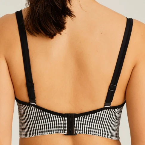 The Atlas Padded Longline Balcony Bikini Top with its cool, retro print is trendy, stylish, and ultra-comfortable. Made from a soft fabric with an elegant checkered pattern this bikini top features lightly padded cups and an extended underband for better support and uplift. A fashionable look at all times with this black and white jacquard fabric.