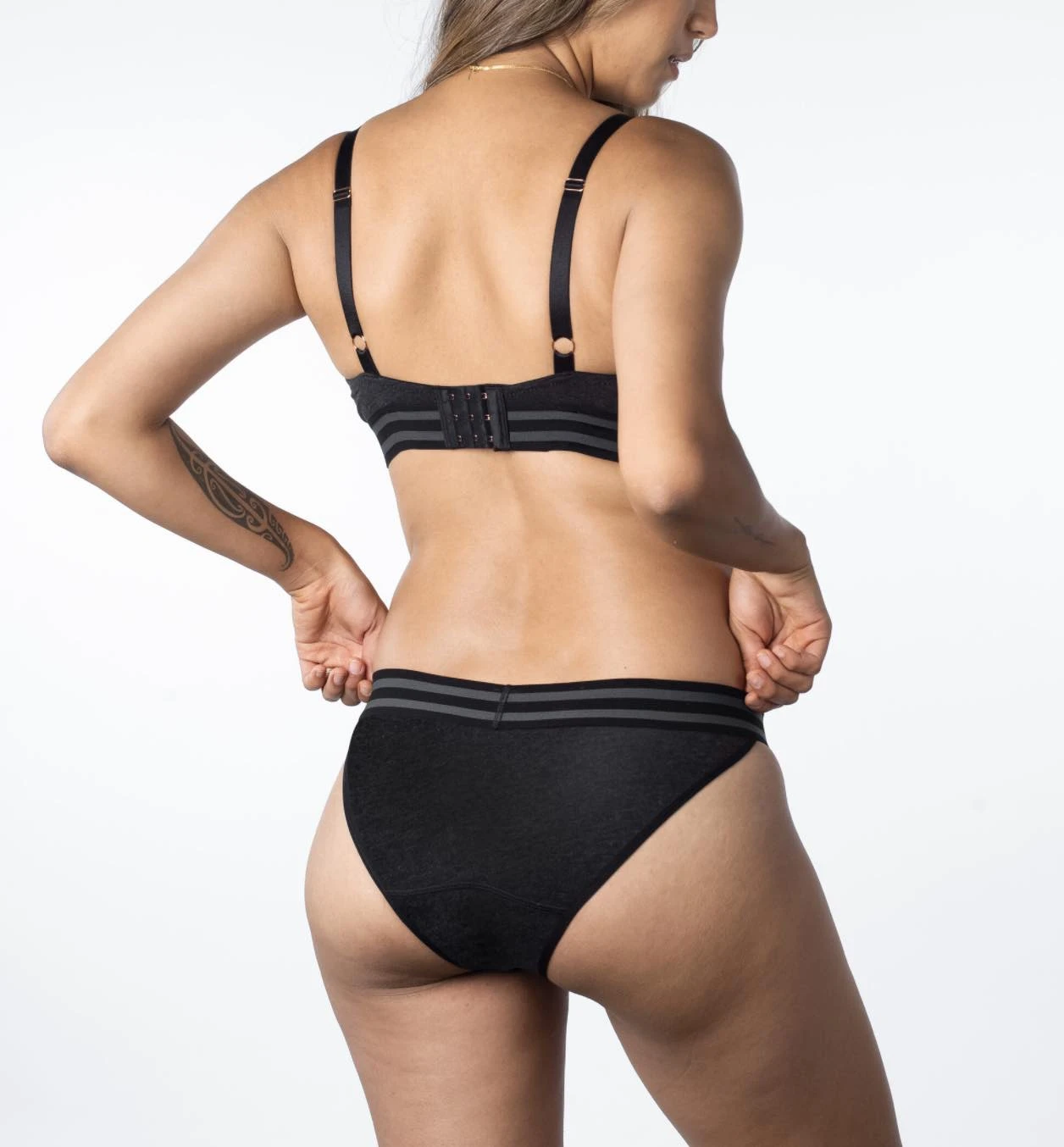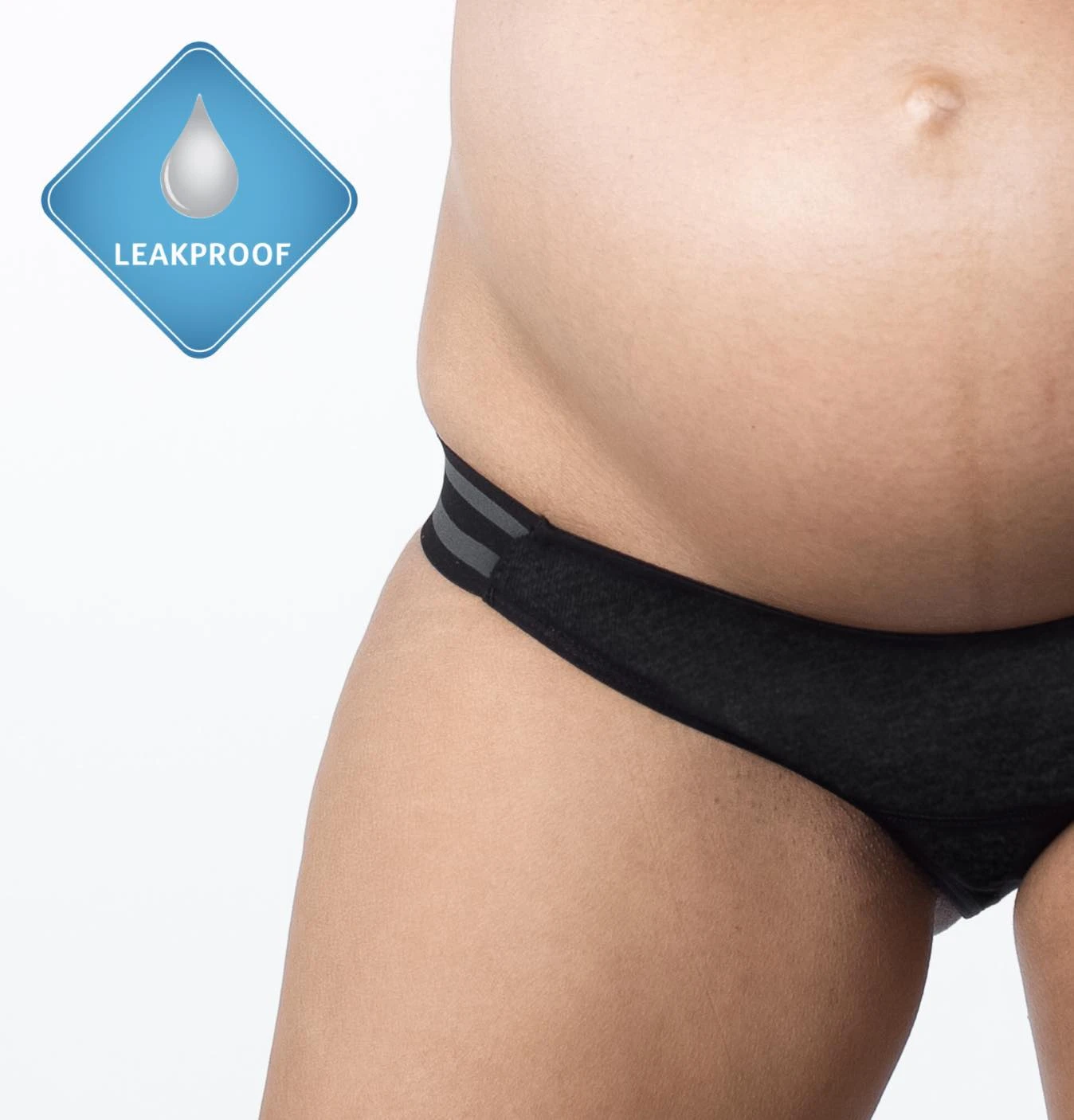 Elevated Cotton Leakproof Bikini Brief in breathable cotton with super soft striped side waist elastic and featuring new light leakproof protection in the gusset for light leaks, discharge, and spotting. Sits low on your growing belly.