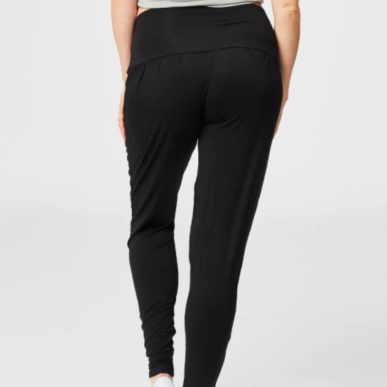 A lounge pant with generous leg room around the thigh tapering to snug ankle fit. The double folded waist fits securely over the belly. Fabric is light to medium weight Viscose from Bamboo with soft handfeel.