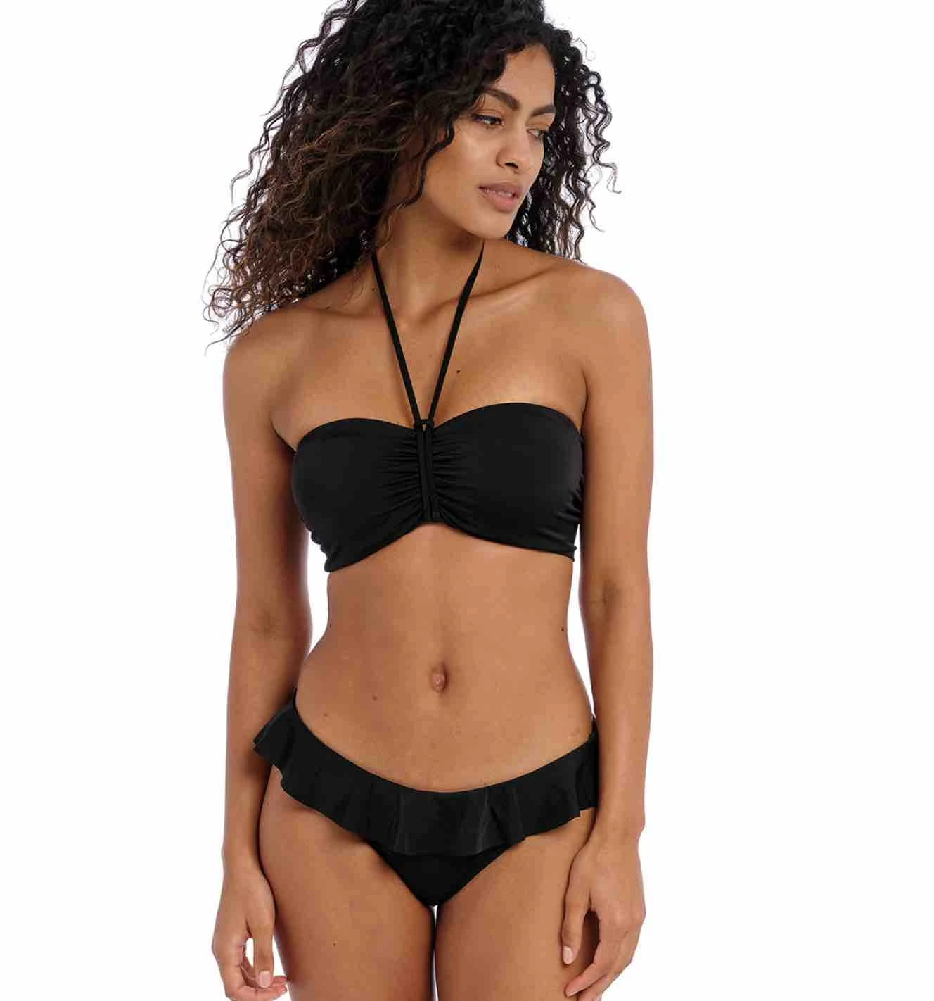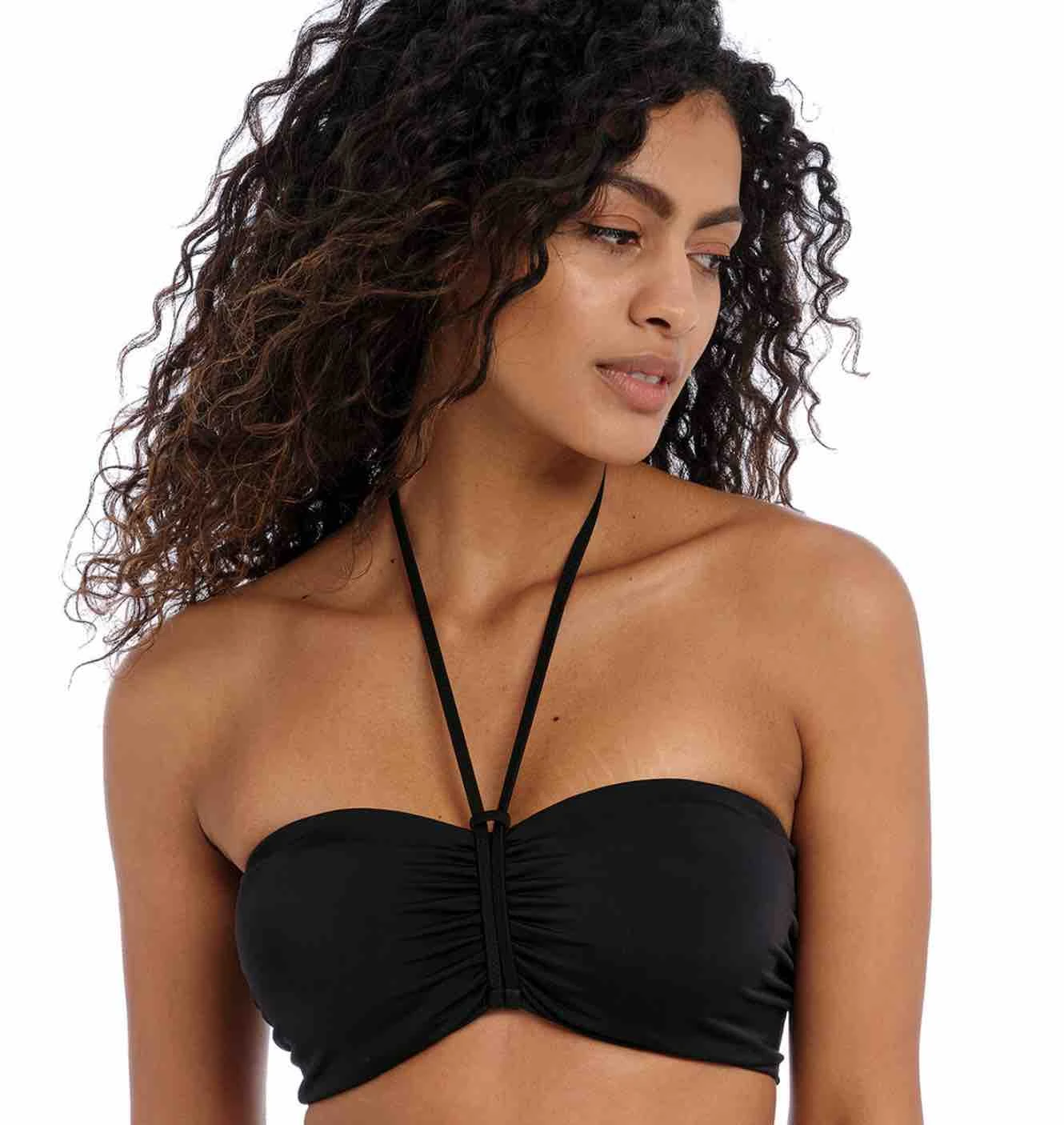 Feel beach ready in Freya’s Jewel Cove Bandeau Bikini Top in Plain Black, lightly padded foam cups offer rounded shape and support, while the flattering gathers at the centre offer a beautiful silhouette and a stylish finish.