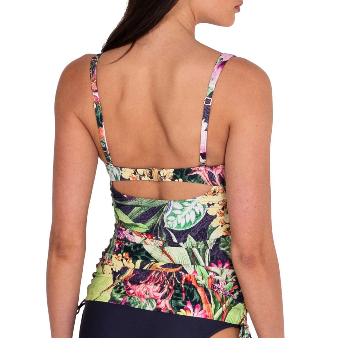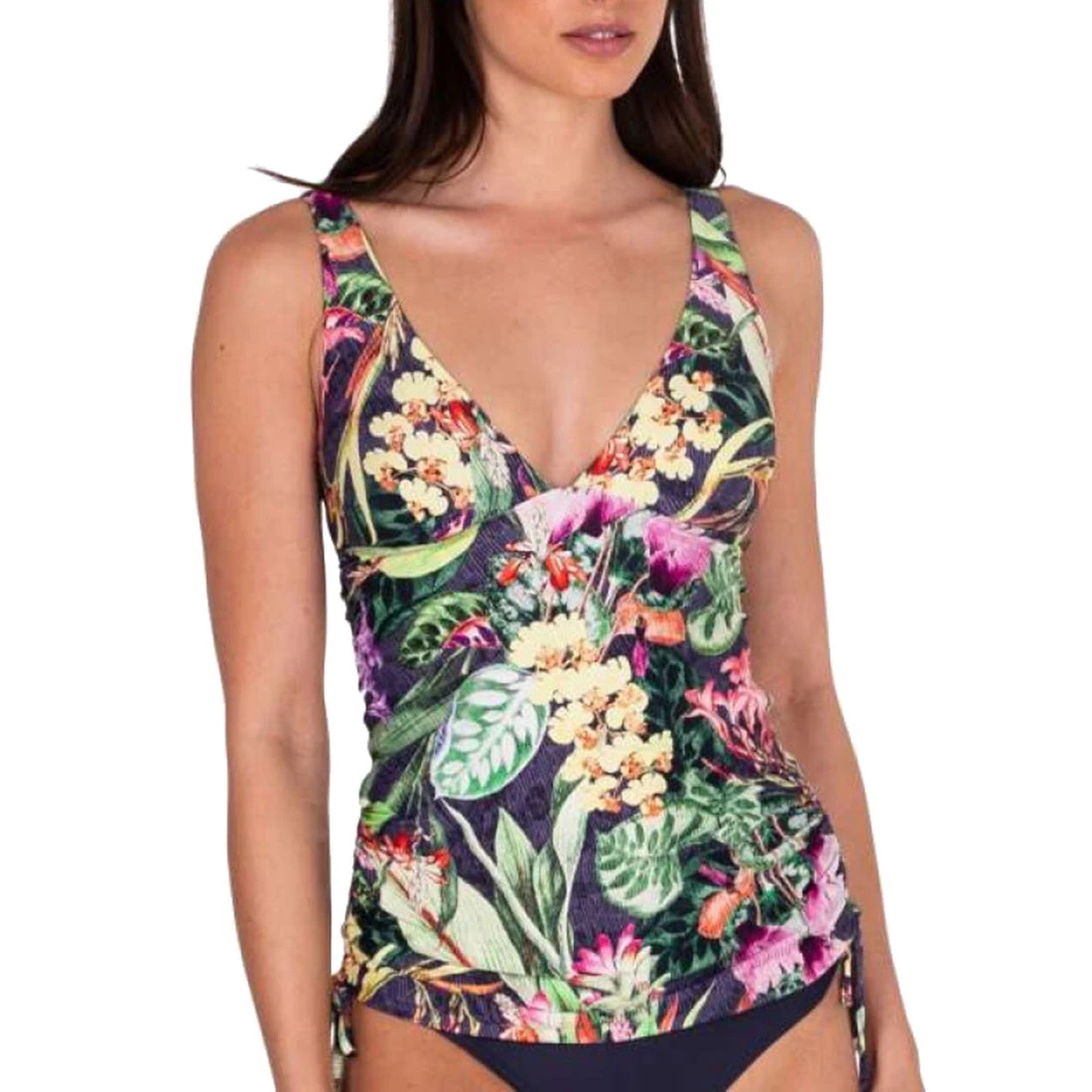A singlet style bikini top. Features removable soft cups, underbust seam support with keyhold back, gathered tie sides for adjustable body length, adjustable shoulder straps, secure clip back. Fully lined using exclusive silky touch lining with elastane for superior fit and body contouring.