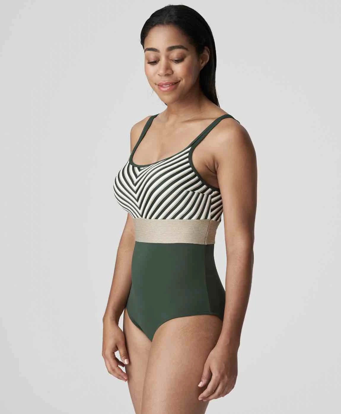 La Concha Wirefree Padded Swimsuit made from premium fabric with stripes on the top and a solid colour on the bottom. The gold panel in between creates an elegant belted effect. In an elegant hue that suits every skin tone, this swimsuit with a square neckline and a deep plunging back offers moderate rear coverage.