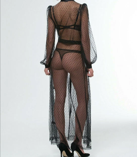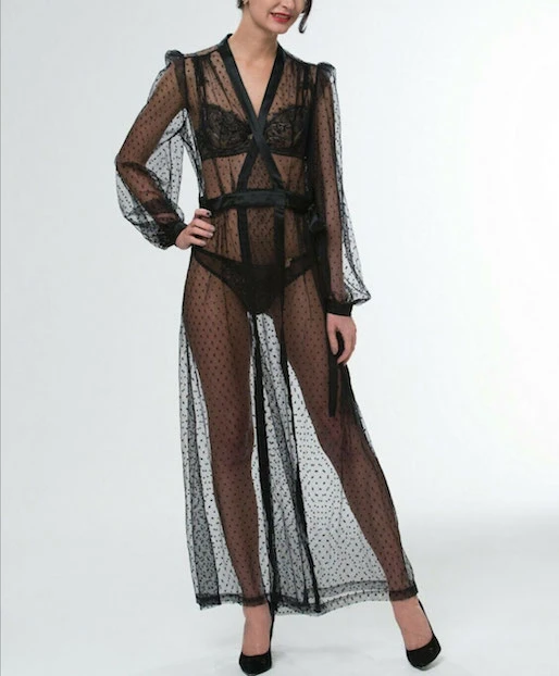 This breathtakingly beautiful La Marr Robe evokes timeless glamour in a floor-sweeping design with sheer spot fabric and luxe satin trims.