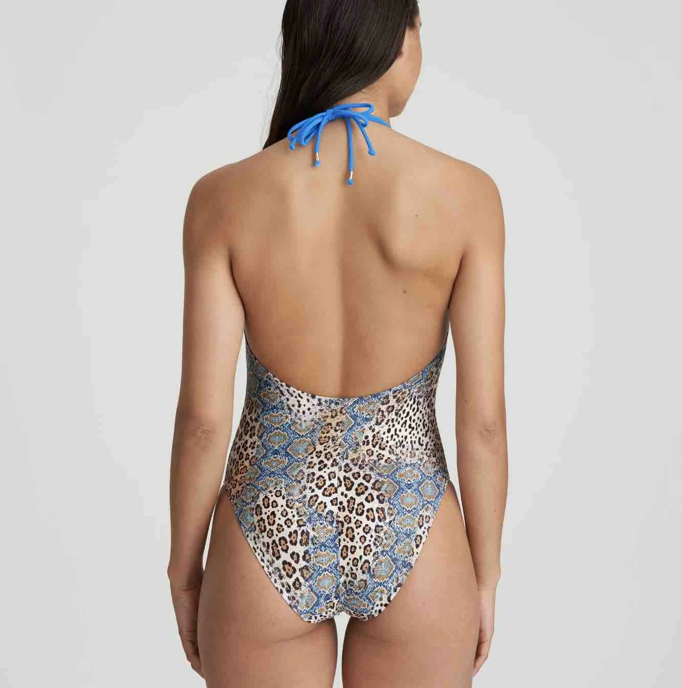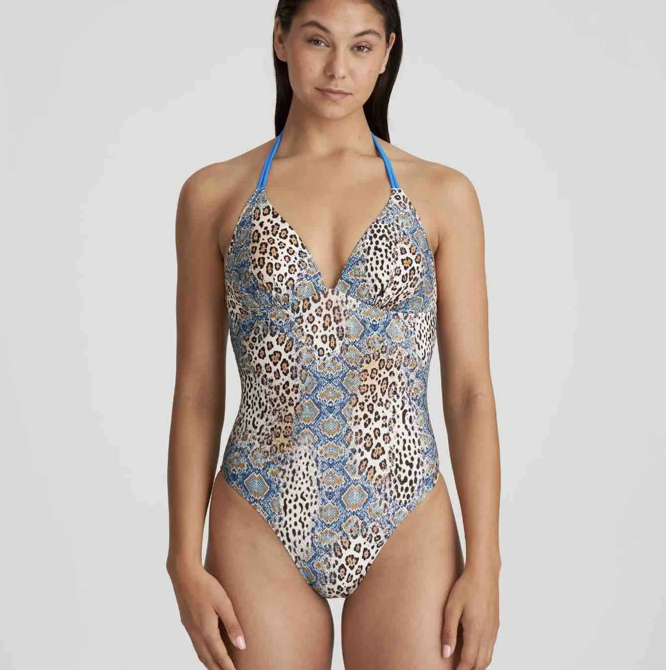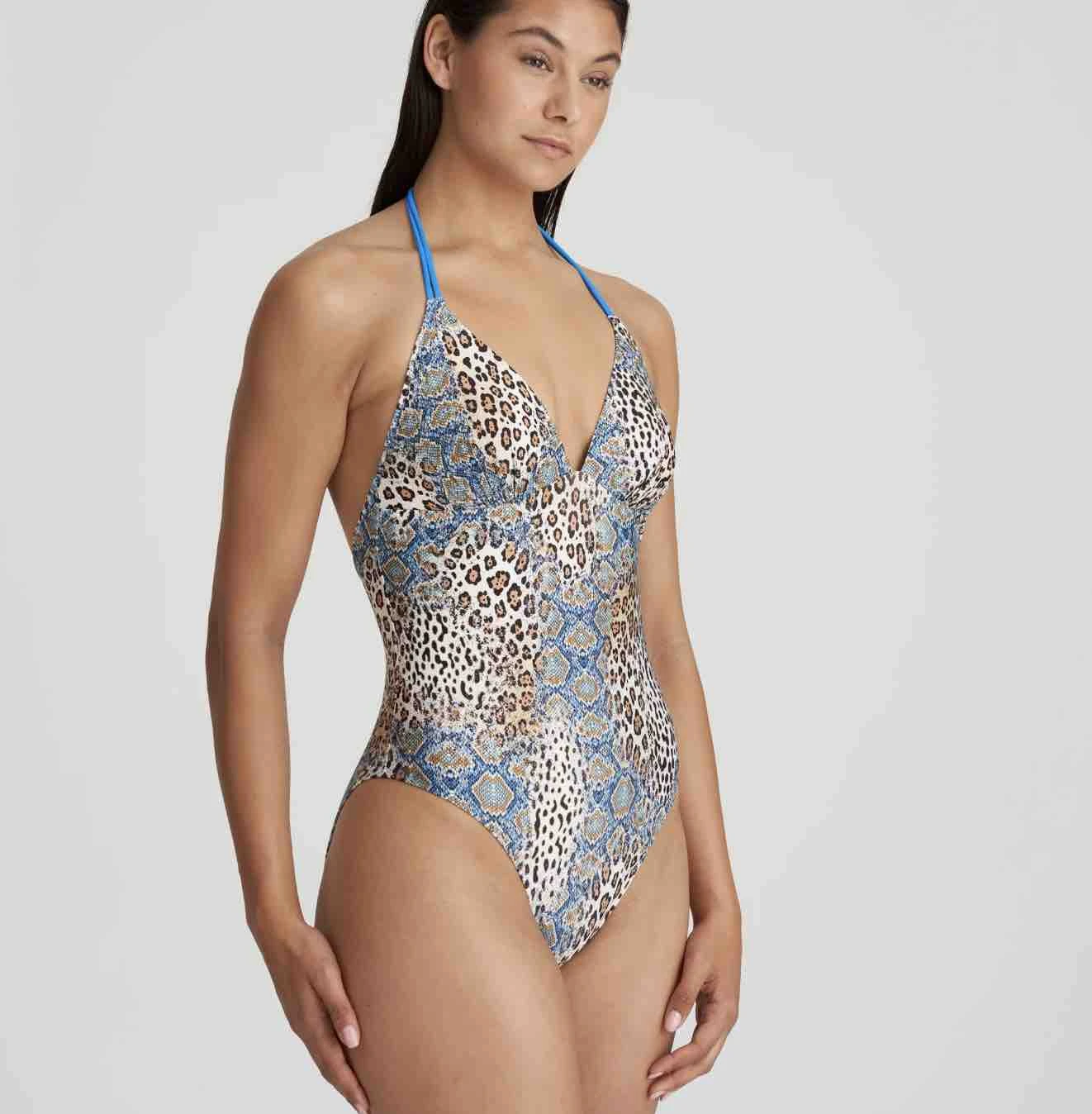 Introducing the Marie Jo Minorca padded swimsuit – a chic and luxurious piece with a flattering triangle design, padded cups, and stunning animal print. It offers wireless comfort, halter spaghetti straps, and a high-leg cut for a beautiful silhouette. Enjoy summer vibes all year round with this stylish and comfortable swimsuit.