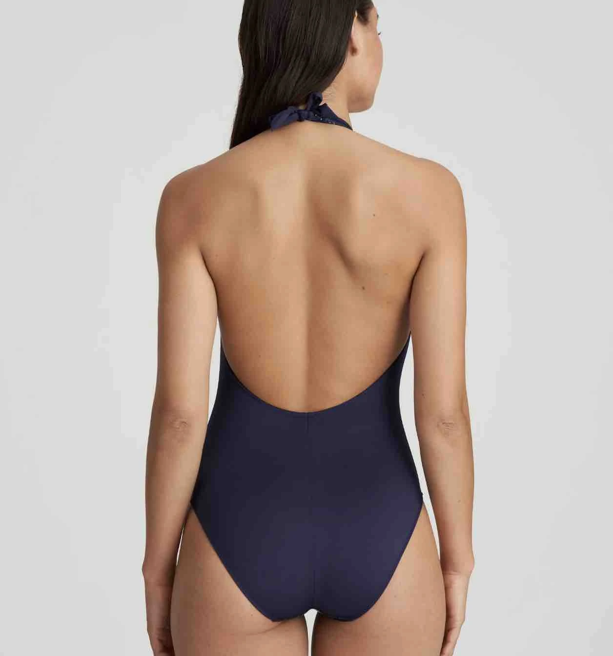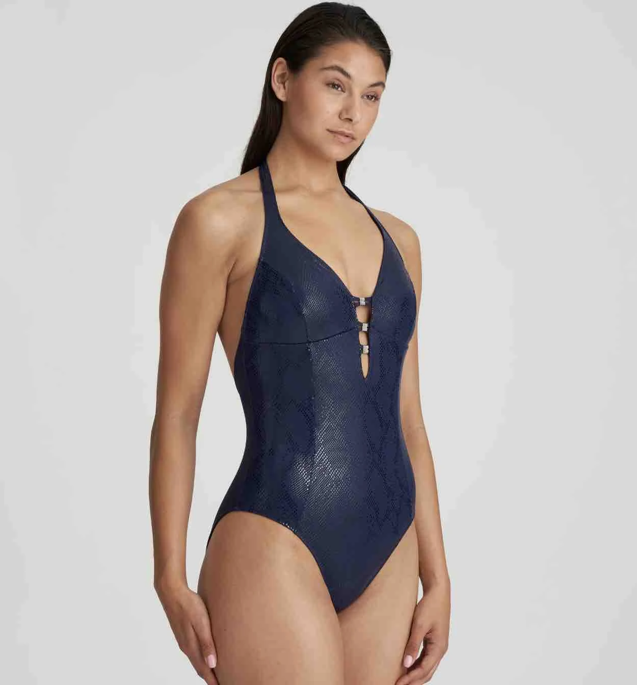 You’ll be the centre of attention in this padded, deep plunge, halter neck swimsuit in shimmery snakeskin fabric. Evening Blue with shimmery snakeskin print, this swimsuit lets you swim in style!