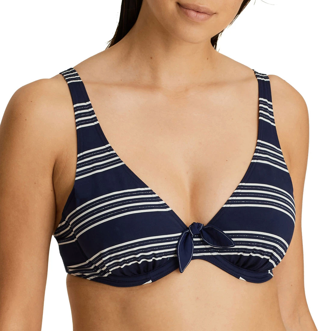 The Mogador Padded Triangle Bikini Top with fine nautical stripes and a centre bow with silver details adds a feminine, retro touch to your beach or poolside look. Underwired and padded cups offer added support and comfort. The triangle style cups are cut low at the centre and accentuate the cleavage. White and silver stripes on a deep blue background is a match made in nautical heaven!