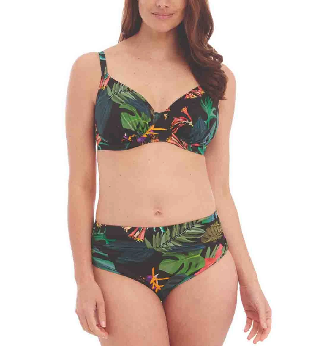 The desire for lush tropical prints is going nowhere this season. Monteverde Gathered Full Cup Bikini Top features palm leaves and botanical flora in bloom. An inky color palette of choice, midnight blues, and teals are offset with pops of Mango and Peridot green.