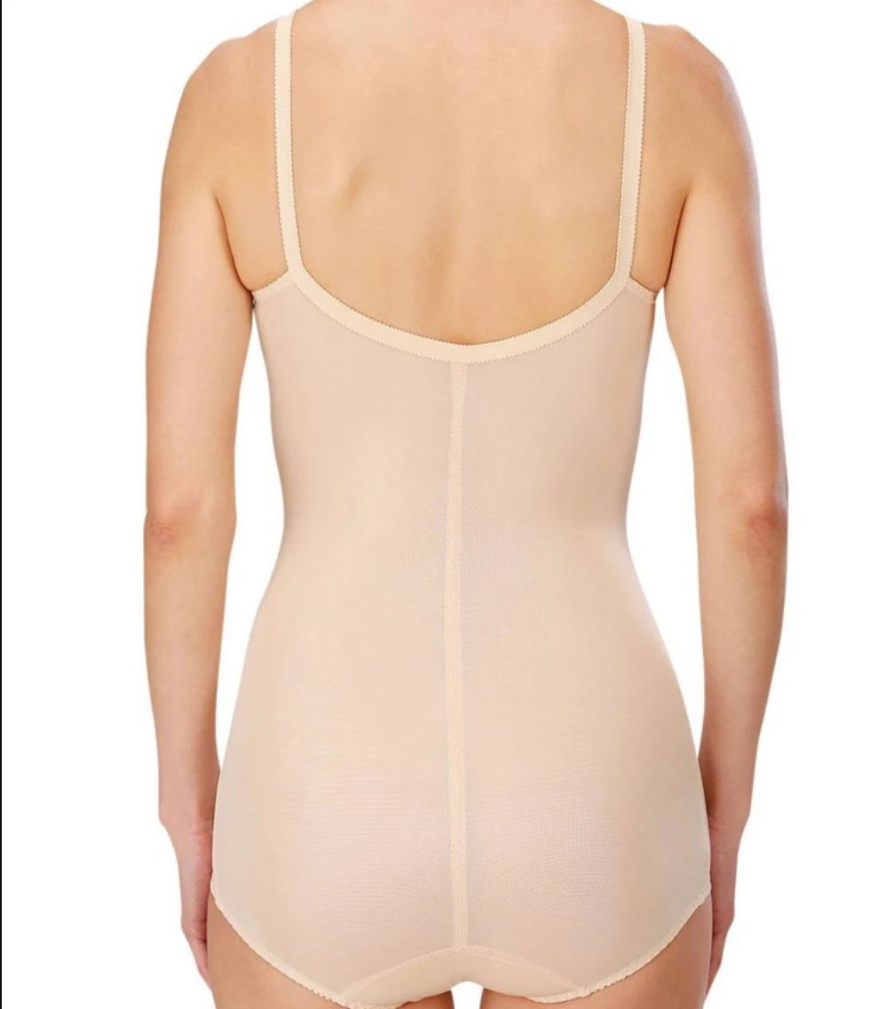 This Naturana panty corselette has reinforced panels and features non-wired, 3-section cups with supporting panels on the sides and under the breasts. It has wide and adjustable straps measuring 2,3 cm (0.9″). It has a high-cut back for extra support and a padded gusset with hook-and-eye closure