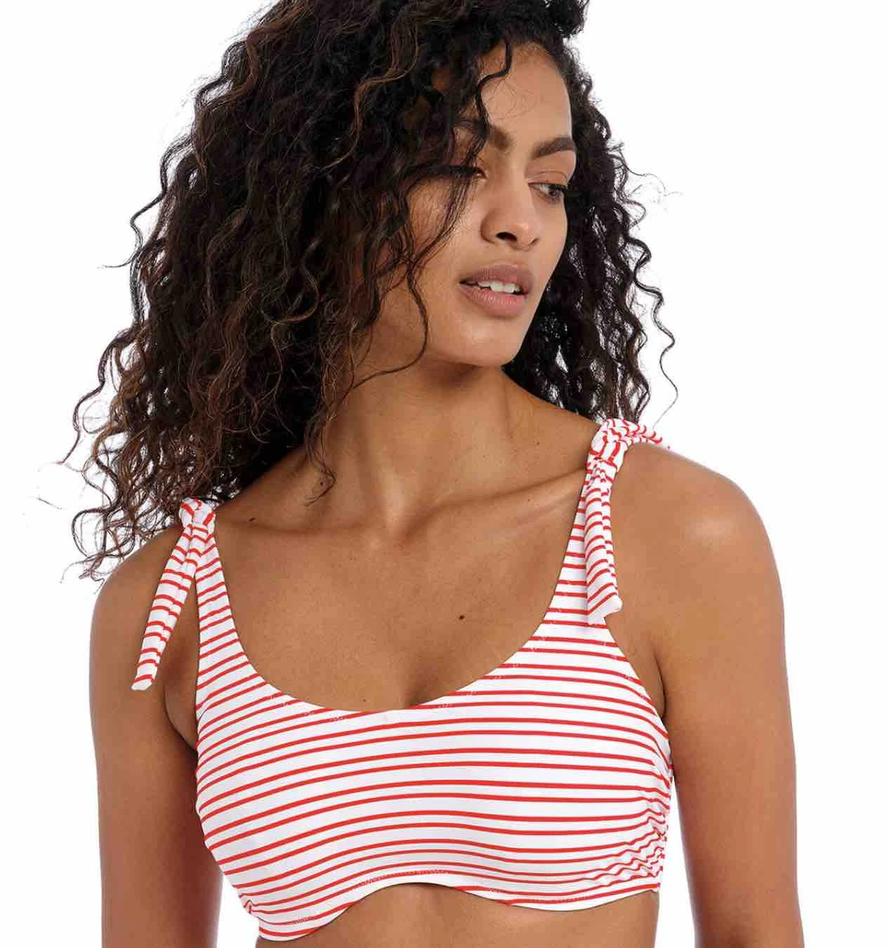 Getaway in style with our New Shores Bralette Bikini Top. Complete with wide straps for a scoop centre front, flattering gathers at the side seam to add shape, volume and capacity, and convertible back straps to allow the design to be worn over the shoulders or as a cross-back style.
