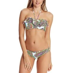 The absolutely stunning New Wave Bandeau Bikini Top features a waterfall frill, with center front detachable ties with tassels, offering lightly padded foam cups for a rounded shape and support, and flattering gathers at the bust and a low center front for less coverage.