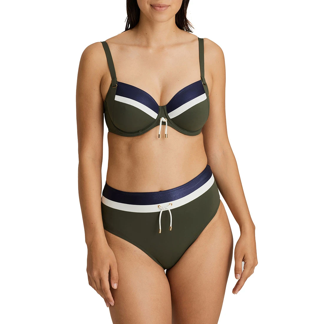 The stylish, non padded, underwired Ocean Drive Full Cup Bikini Top with a flattering sporty-chic look offers comfort, support and uplift. Perfect for a day at the beach or by the pool, this bikini top in Dark Olive is an elegant mix of khaki and midnight blue with ivory accents.