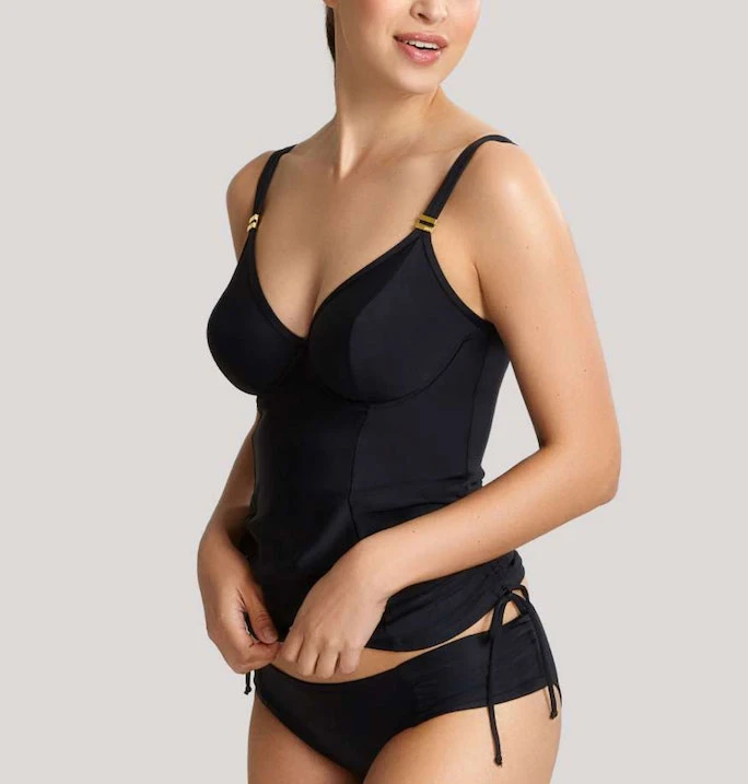 This versatile Anya Riva Balcony Tankini offers great support from D to J cup, with a flattering plunging neckline and inner non-padded cups. Its small details bring a luxury feel, including split straps, drawstring sides, and gold finishing touches.