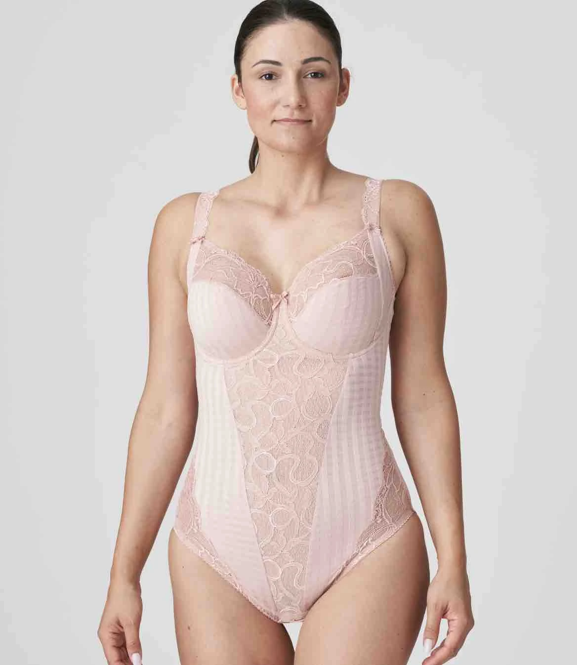 The Madison Bodysuit in Powder Rose has it all, class and comfort! Featuring gorgeous lace on the torso and the cups that frame and highlight your curves, and underwired cups to ensure your bust is supported and lifted. Full rear coverage with a lace trim adds a flirty touch to this high coverage bodysuit. The straps are adjustable so the fit can be tailored to your own preference. With a simple pull-on design and crotch fastening, this bodysuit is absolutely indispensable in your lingerie drawer.