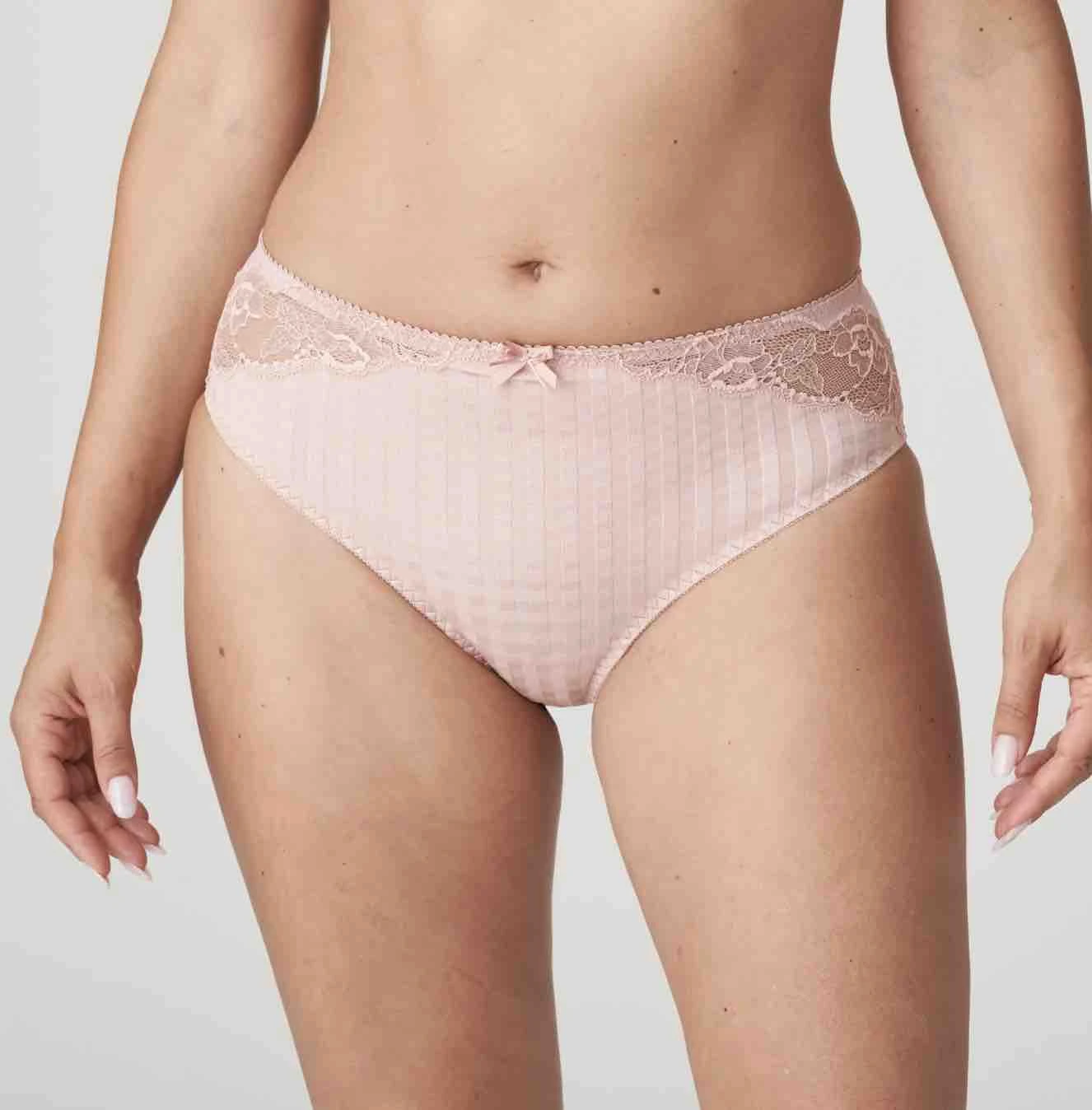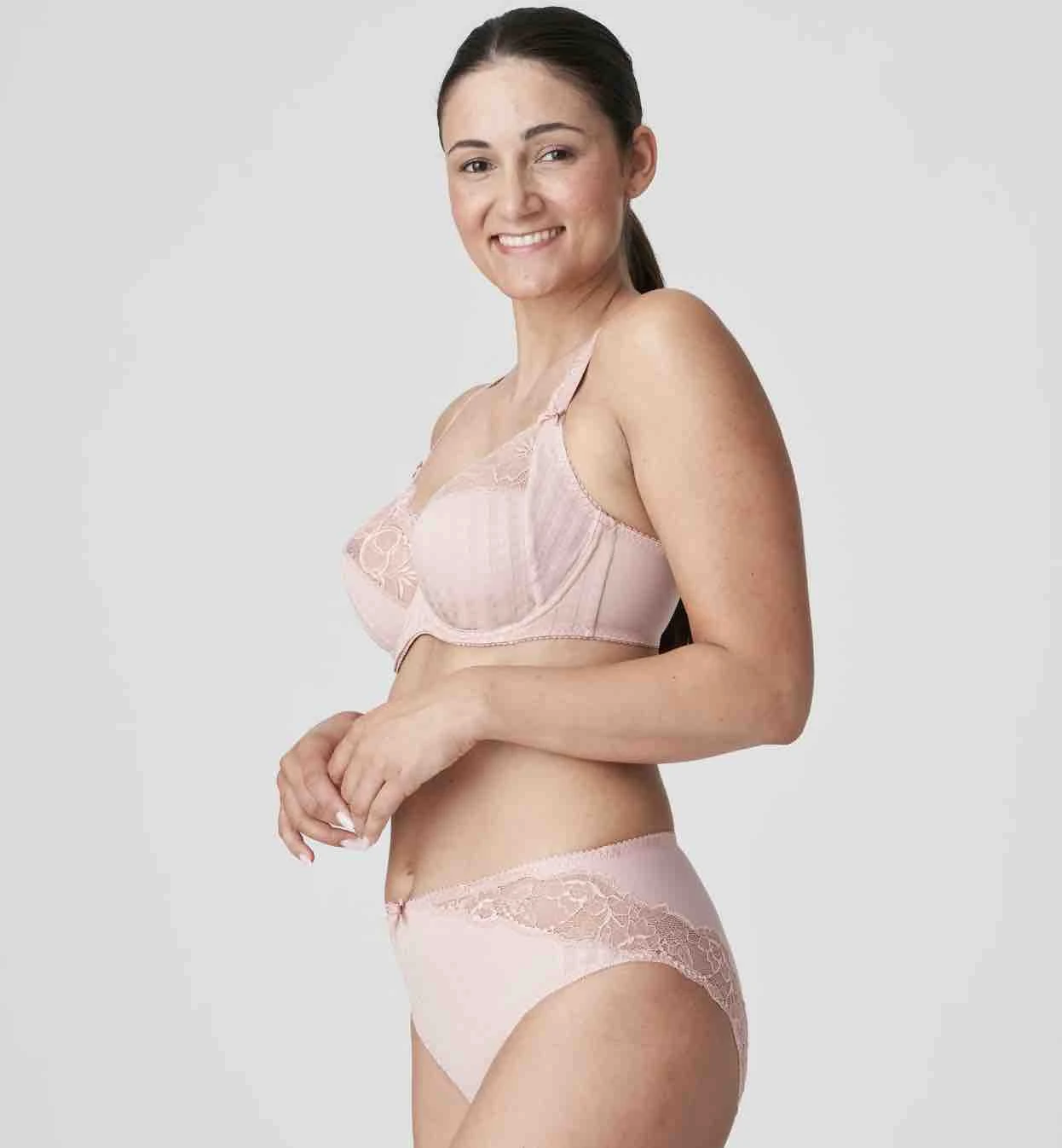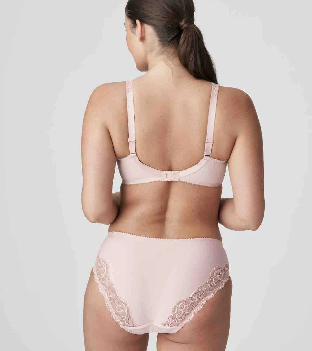 The high-waisted Madison Full Brief in Powder Rose features a luxurious semi-sheer lace trim that starts at the hips and continues downwards to frame your curves. These elegant and comfy briefs offer full rear coverage.