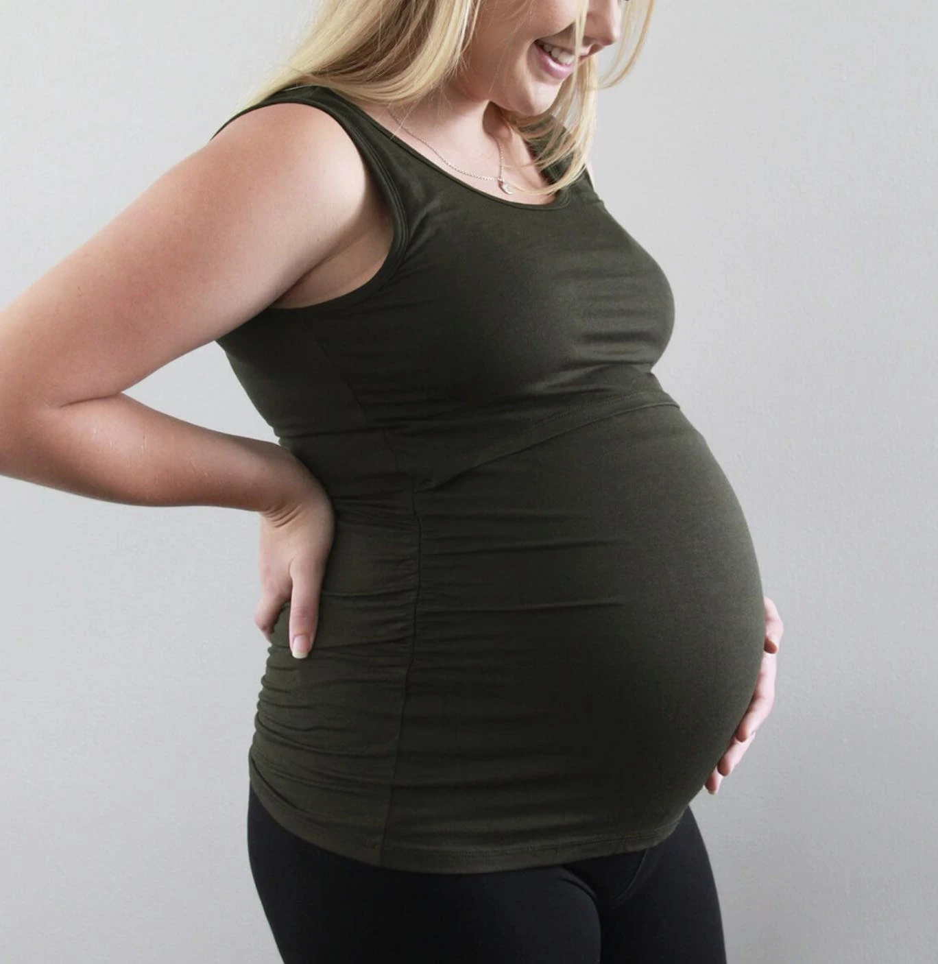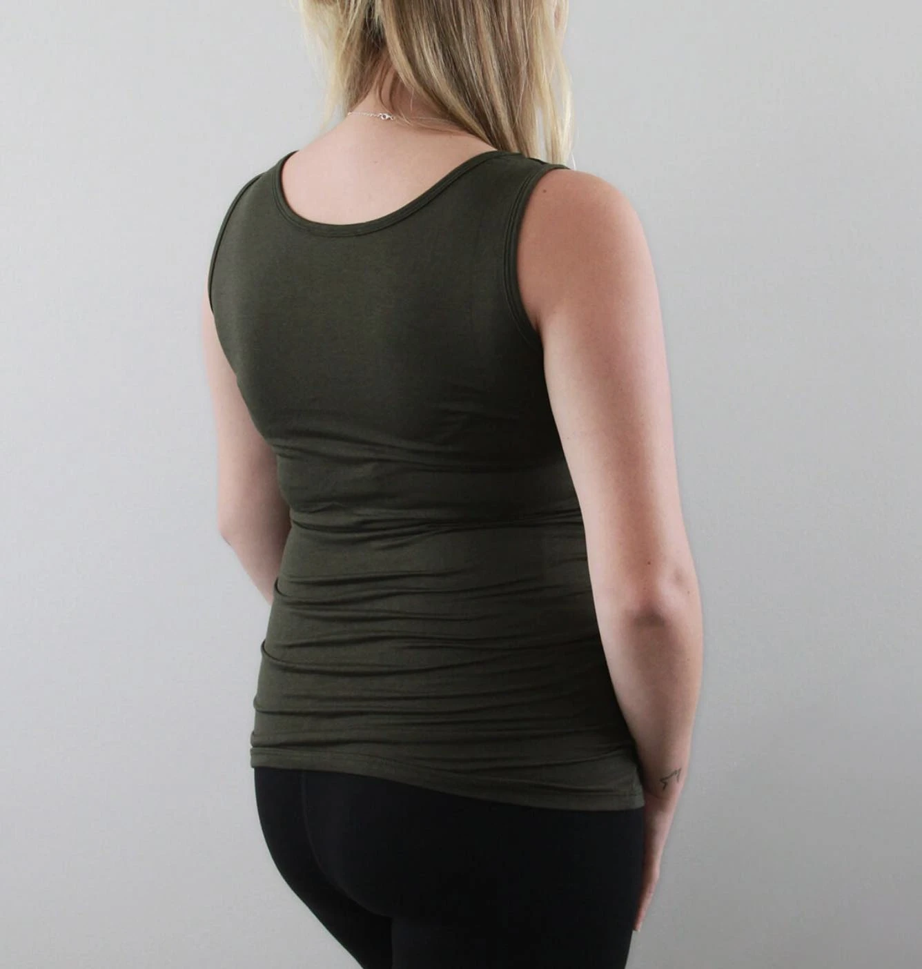 Medium height neckline tank with fitted appearance. Double layered with ruching on the sides is perfect for pregnancy belly or concealing postpartum curves. Medium weight combination bamboo and cotton with dry and soft hand feel. Hemline