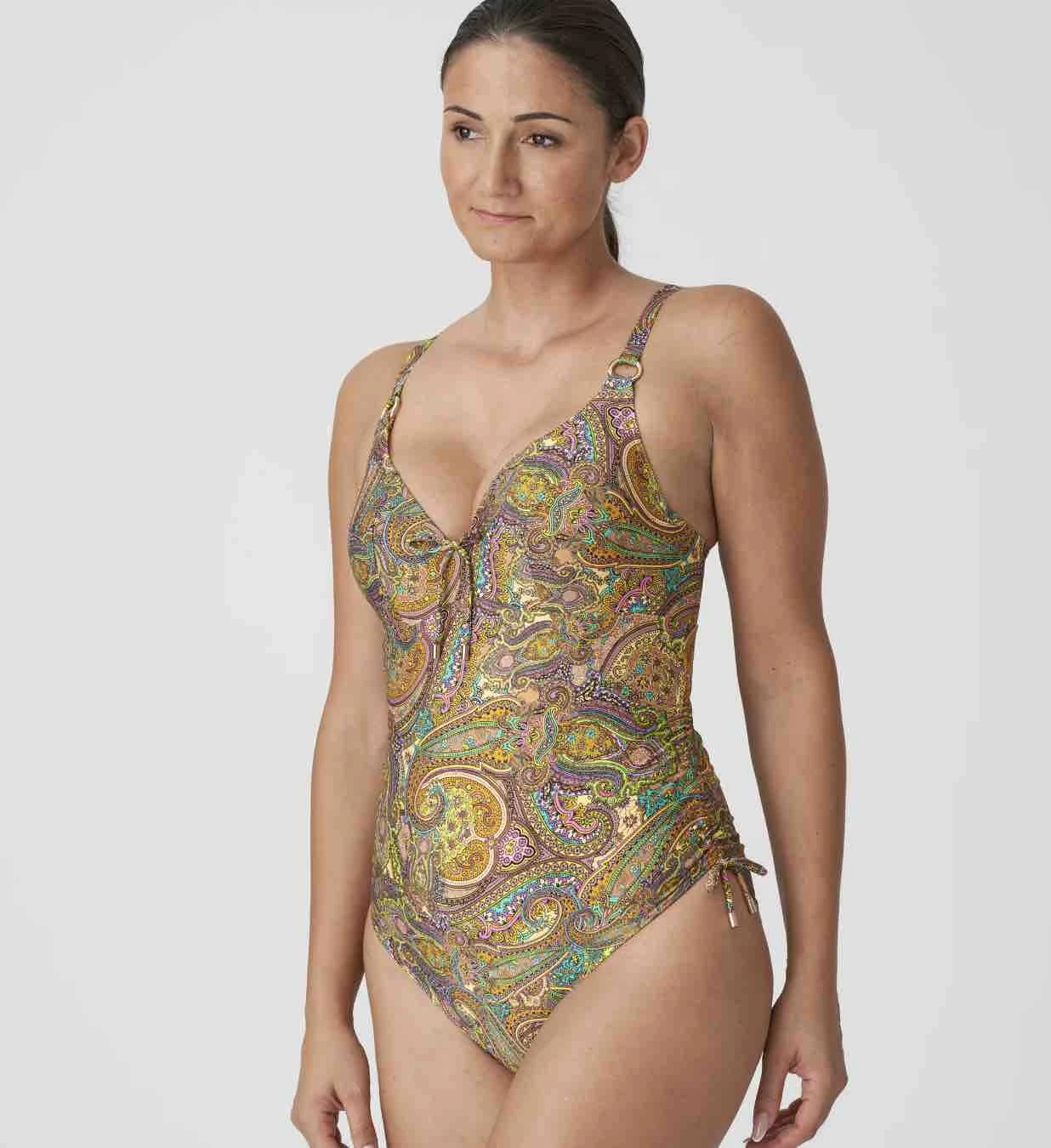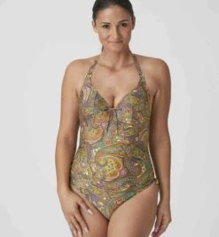 The Stylish one-piece Sakarun Plunge Swimsuit with deep plunge triangle cups will flatter your curves. The sturdy, double-lined underwired cups lift and centre the breasts for irresistible cleavage and the high-cut adjustable legs create the striking illusion of longer looking legs.