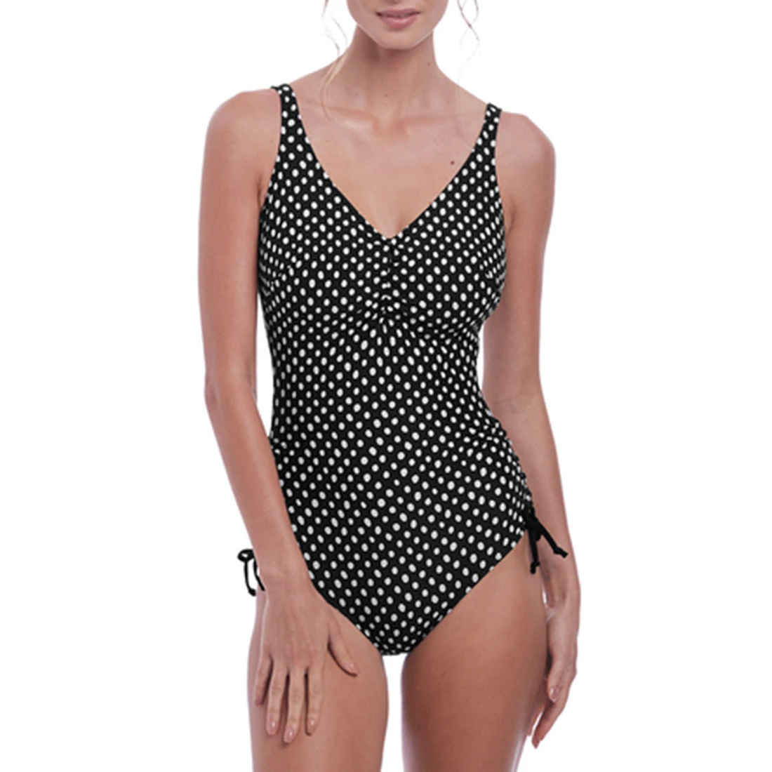 Chic and monochromatic, make your poolside look iconic with Santa Monica. Crafted from a Spanish pique textured fabric with white spot detail on a black ground, look out for our new bandeau shape for AW19 which features a drop centre front design, as well as a variety of additional styles and coverage levels.