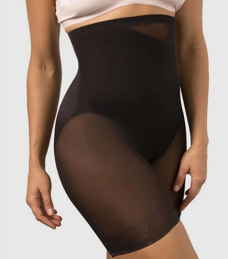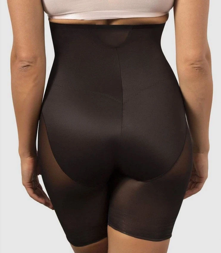 This hi-waist thigh slimmer from MiracleSuit features sexy, sheer panelling which allows the garment to adjust to your body and create a perfect fit. The double panels provide extra firm control and shaping but maintain a smooth look under your clothes. Choose it to shape your midriff, and slim your tummy, hips, & thighs.