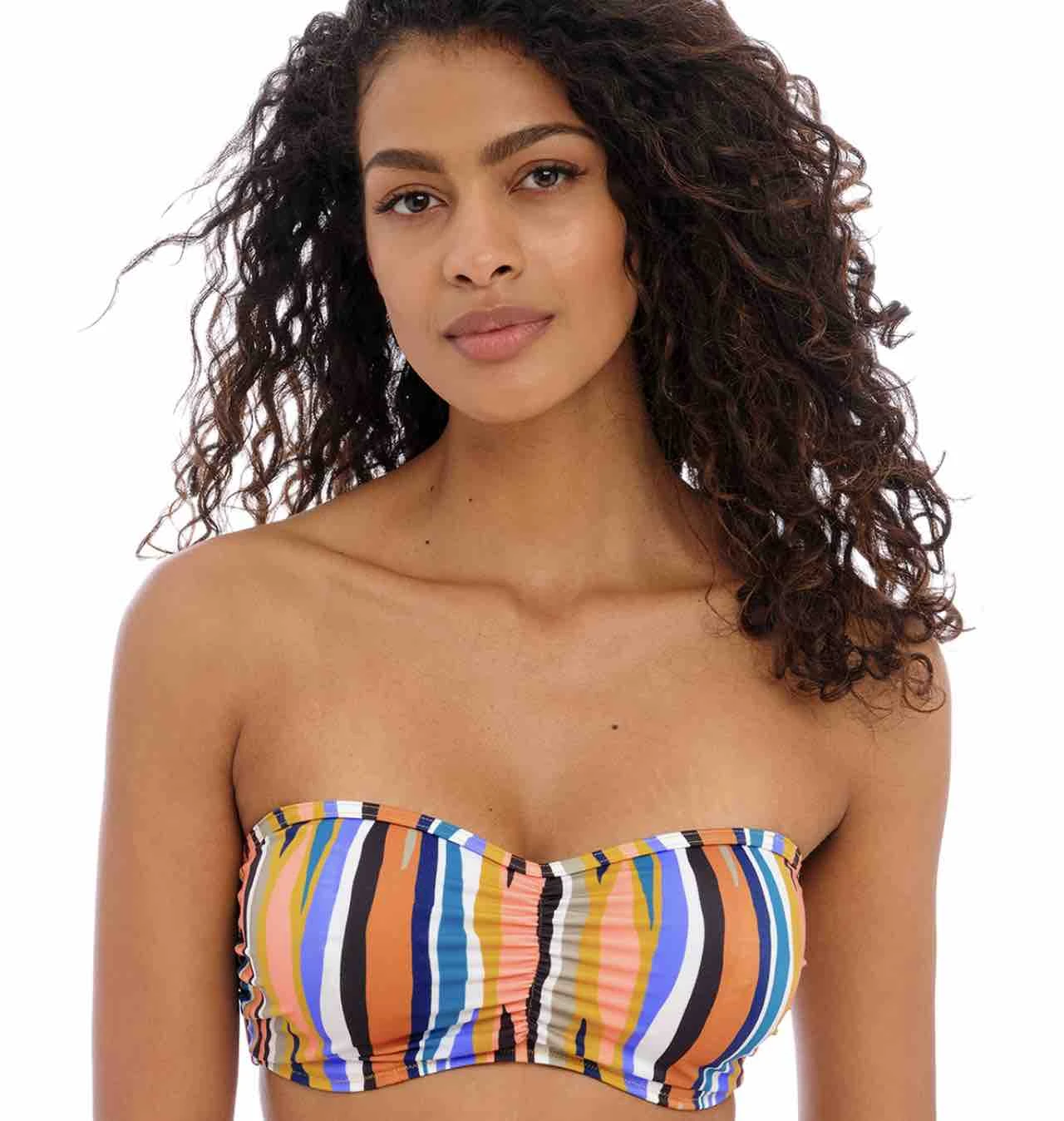 Animal print meets an abstract stripe design in Freya’s Torra Bay Bandeau Bikini Top, underwired lined cups are fit for shape and support with flattering gathers at the bust. Detachable, adjustable straps allow this style to be worn over the shoulders or as a cross back, complete with a rose gold metallic detail on the end of the ties.